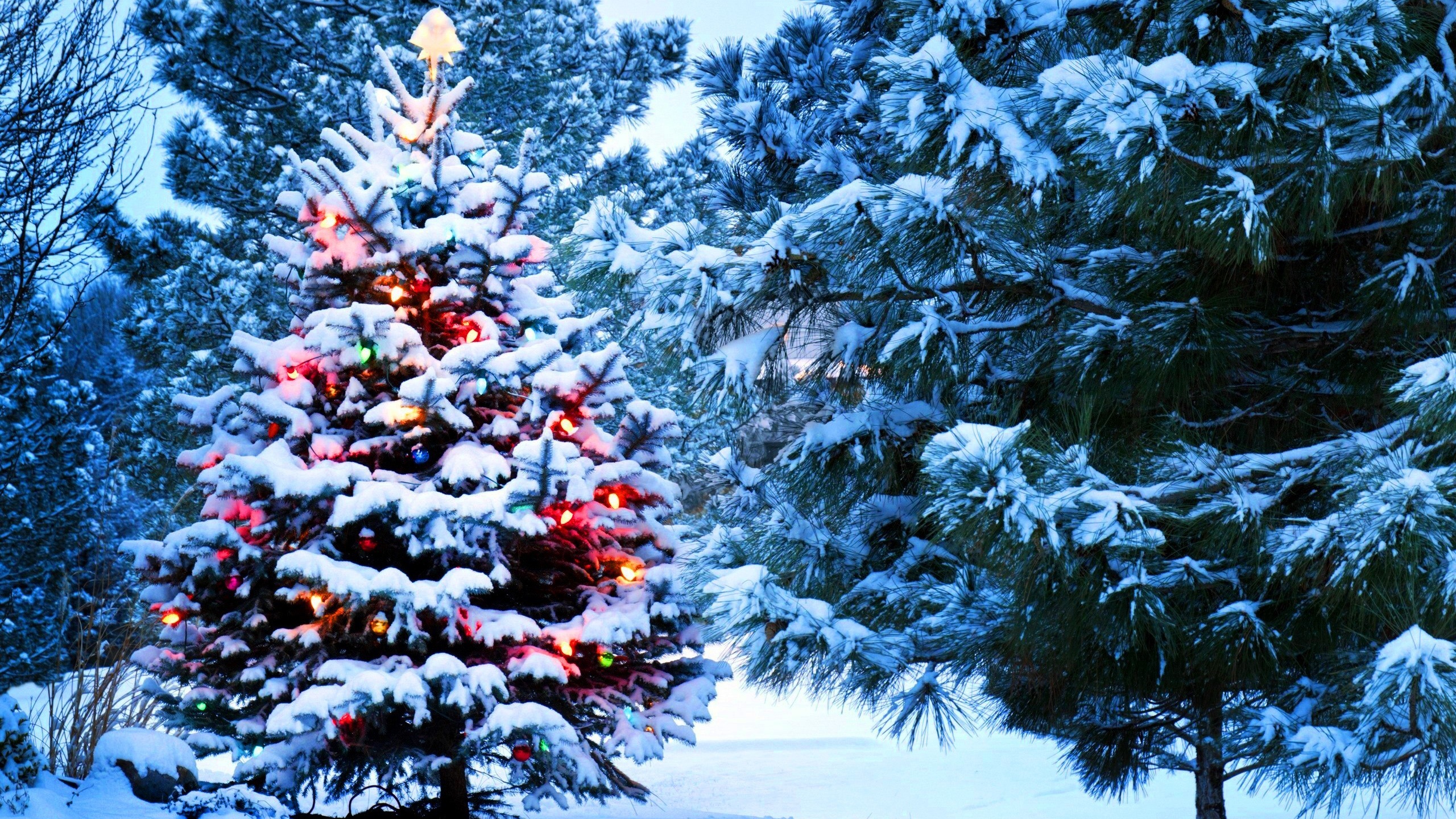В голубых зелёных елях светят белые игрушки.