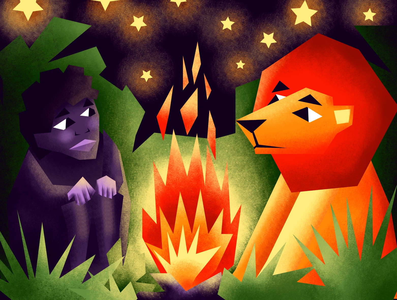 На листьях сверху играл еще не потухший костёр…И тут я услышал его мягкие шаги. Он идёт бесшумно, но я то научился его слышать издалека. Я знал, он идет ко мне. Я как друга ждал его. И вот он вышел в свет от огня. Было поразительно, но он не боялся этого обжигающего пламени, он как будто купался в оранжевом свете. Я присматривался к нему и решил спуститься, чтобы увидеть поближе. Мы сидели напротив друг друга по разные стороны костра. Я смотрел на его густую гриву, в этом свете она выглядела как языки огня. У него были большие лапы, крепкая мускулатура, он был величественный. Он смотрел прямо мне в глаза. Мне захотелось подойти к нему, ведь он свои шаги навстречу сделал и он ждал, я знаю. Я подошел и сел рядом, мы переглянулись. Я не боялся. Моя рука потянулась к нему и погладила его по мягкой шерсти, рука тонула в гриве. Мы сидели так долго. Я знал, он поможет мне в пути. Этот могущественный зверь проведет меня сквозь джунгли, нам вдвоем не страшно ни что, всё покорится этому союзу. Я открыл глаза. Первые лучи солнца уже пытались пробиться сквозь листву и немного освещали полянку. Пора вставать и идти навстречу миру! Но я всё лежал и думал о том, что мне снилось. Чувство родства душ не покидало меня. Прекрасный сон, он вселял в меня уверенность. Что это было? Хранитель? Мой предок? Душа джунглей? Не важно, я знал, он теперь со мной, он будет меня сопровождать.