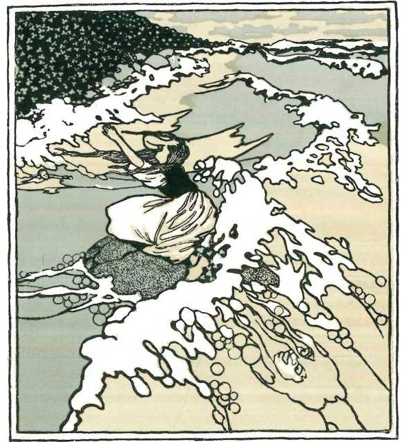 Андрей не был мертв и скоро пришел в себя. Он лежал на великолепной постели из нежнейшего пуха чаек, – пуха, который сами чайки вырывают у себя, чтобы устроить гнездо и согреть своих птенчиков. Постель находилась в гроте, сделанном из перламутра, жемчуга и кораллов. Но только потом уже Андрей рассмотрел всё это великолепие; сперва его взгляд остановился на двух прекрасных девушках, которые сторожили его во время сна. Они были одеты в длинные зелёные платья, а в волосах у них были вплетены нитки жемчуга.