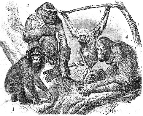 Человекообразные обезьяны имеют туловище в роде человеческого, но передние конечности их длиннее, а задние – короче, чем у человека. Тело их покрыто длинной тонкой шерстью, но лицо и пальцы – голые. Зубы похожи на человеческие, но клыки у старых самцов не уступают по остроте и величине клыками хищных зверей. Живут эти обезьяны в Старом Свете, именно в Азии и Африке. Все семейство заключает четыре рода: горилла (Gorilla), шимпанзе (Simia), орангутанг (Pithecus) и гиббон (Hylobates), заключающих в себе несколько видов.