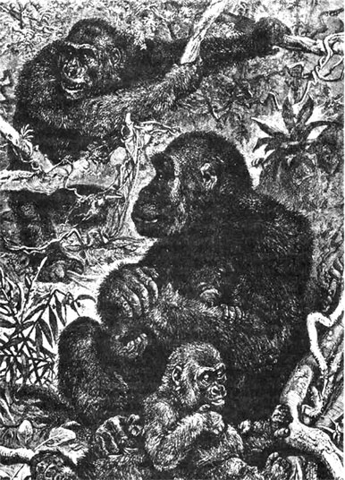 Мы стояли неподвижно, ожидая нападения. Увидев это, чудовище еще страшнее засверкало глазами; волосяной гребень на лбу его начал подниматься и опускаться, длинные клыки оскалились – и вновь загремел грозный рев. В это мгновение горилла походила на адское видение, на одно из тех отвратительных существ – полулюдей и полузверей, которых старинные живописцы любили изображать на картинах ада. Чудовище сделало несколько шагов вперед, остановилось, издало свой ужасный вой, потом приблизилось еще немного, снова остановилось и начало яростно бить себя в грудь. Таким образом, оно было от нас всего в шести шагах, когда я, наконец, выстрелил… Со страшным, человеческим стоном, в котором, однако, слышалось и что-то звериное, оно повалилось лицом на землю. Несколько минут его тело конвульсивно подергивалось, затем все стихло – смерть сделала свое дело. Мне оставалось лишь исследовать огромный труп; оказалось, что тело имело 5 футов 8 дюймов в длину; развитие ручных и грудных мускулов свидетельствовало о необычайной силе животного».