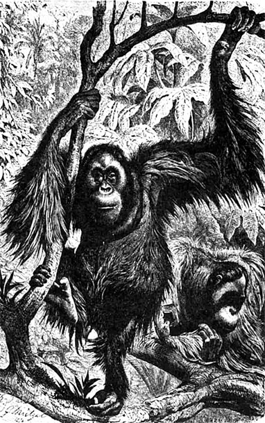 Третий представитель человекообразных обезьян, орангутанг (Pithecus satyrus) – тоже очень известное животное. Уже древний мир знал его. Плиний говорит, что «в горах Индии ворочаются сатиры, животные очень злые, с лицом человека, передвигающиеся то на двух, то на четырех лапах, что бегают они очень быстро, и захватить в плен можно только больных и очень старых».