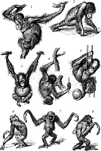После него другой медик, Бонциус, описал оранга с полною точностью. Он говорит, что сам несколько раз видел «лесных людей». «Ходят они довольно часто на задних ногах, и движения их совершенно похожи на человеческие. Особенно удивительна была одна самка. Она стыдилась, когда ее рассматривали незнакомые люди, и не только лицо, но и все свои голые части прикрывала руками: она вздыхала, плакала и до того поступала по-человечески, что ей недоставало только дара слова, чтобы быть вполне человеком». К сожалению, путешественники позднейшего времени, с целью придать более пикантности своим рассказам, извратили описания упомянутых ученых, так что только в последнее время удалось вполне выяснить хотя бы главные, существенные черты организации орангутанга.