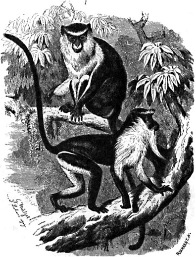 Род мартышек (Cercopithecus), так обыкновенных везде в зверинцах, водится в тропических странах Африки, в сырых лесах, по берегам рек и морей, там, где водятся и попугаи. Их несколько видов, но все они отличаются стройным, красивым телом, одетым в довольно яркую, иногда пеструю шубу, с длинным хвостом без кисти. Тонкие конечности, короткие руки с очень длинным большим пальцем, большие защечные мешки, которые натуго набиваются плодами, и значительные седалищные наросты – характерные признаки этой живой, веселой породы обезьян.