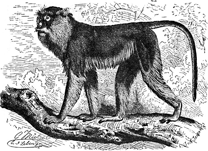 Из многих видов мартышек отметим следующие: 1) зеленая обезьяна, или обуланж, а также ниснас арабов (Cercopithecus sabaeus), до 1/2; арш. в длину, причем хвост занимает половину; верхняя часть тела покрыта светло-зелеными полосами, конечности и хвост – пепельно-серые, бакенбарды беловатые, лицо светло-бурое, морда, нос и брови черные; на западе Африки встречается близкий вид, может быть, только разновидность ее, C. griseoviridis; 2) диана, или бородатая мартышка (C. diana), маленькое стройное животное, которое легко узнать по длинным бакенам и бороде; тело ее большей частью темно-серое, спина пурпурно-коричневая, а нижние части тела – белые; 3) мона (C. mona), похожая на диану, но каштаново-бурого цвета с желтовато-белой грудью, без бороды. Длина ее – около 2 ф., хвост несколько больше; 4) муйдо (C. cephus), живущая в Леанго, а также в Нижней Гвинее, голуболицая мартышка с роскошным мехом оливково-зеленого цвета с золотистым отливом; лицо – голубое, цвета кобальта; борода – ярко-желтая, хвост ржаво-красный. Вообще, это наиболее ярко и красиво окрашенная обезьяна. Любимое место обитания – болотистые прибрежные леса. Описание нравов мартышек, приведенное нами выше, относится главным образом к голуболицей мартышке; 5) гусар (C. ruber), красная восточноафриканская обезьяна, в противоположность предыдущим видам, одна из скучнейших и неприветливых мартышек. По росту она наполовину или на треть больше предыдущих, название получила от ржаво-красного, иногда золотисто-красного цвета шерсти на спине; лицо у нее черное, бакенбарды – белые, нижняя часть тела также белая. Водится по преимуществу в степных местностях. Нрав у нее неуживчивый: гусар во всех видит своих врагов, все ему надоедает, и самые невинные шутки принимаются за обиду. Простой взгляд сердит его, а хохот приводит в страшную ярость. Ввиду такого характера его что-то не видать в неволе.