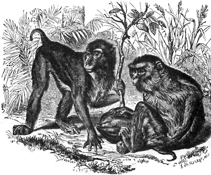 Наиболее известен из макаков – яванский макак, или моньет яванцев (Macacus cynomolgus), небольшое созданьице с телом в полтора фута и такой же длины хвостом, распространенное по всей Юго-Восточной Азии. Цвет шерсти – довольно неопределенный: на верхней части тела оливково-бурый с черным, на нижней – светло-серый; кисти, ступни и хвост черные. Пищу его составляют как плоды всевозможных деревьев, так и крабы и моллюски; поэтому стада макаков можно встретить и в лесу, и на берегу моря.