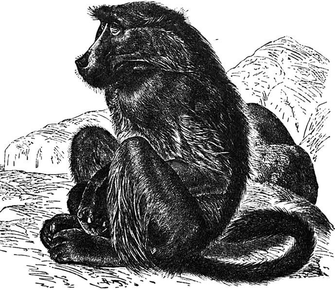 Из других представителей рода павианов следует упомянуть еще о гамадриле (Cynocephalus hamadrias), живущем в горах Абиссинии и Южной Нубии, поблизости воды и растительности, еще лучше – полей. Эти оригинальные павианы, достигающие в длину до 1 1/2 арш., причем только 8 дюйм. приходится на хвост, украшены длинной мантией, длина волос которой доходит до 10–12 дюймов. Рано утром, в хорошую погоду, стадо гамадрилов медленно и спокойно отправляется вдоль отвесных скал, причем то сорвут растение, корень которого употребляется ими в пищу, то свернут с места камень, чтобы достать из-под него улиток или насекомых. К вечеру, нагулявшись и вволю насытившись, стадо направляется на ночлег, поблизости какого-нибудь поля.