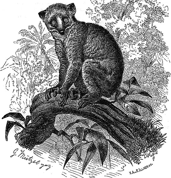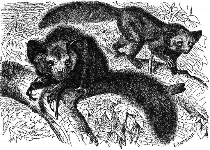 К этим наблюдениям, написанным в 1863 г., я хочу прибавить данные, позднее (1868 г.) обнародованные Полленом, так как они существенно пополняют сведения о жизни ай-ай на свободе. «Это животное, столь замечательное в научном отношении, – говорит наш сотоварищ, – живет предпочтительно в бамбуковых лесах внутри большого острова. Питается оно сердцевиной бамбукового дерева или сахарного тростника, а также жуками и их личинками. Чтобы достать себе пищу, состоит ли она из сердцевины бамбукового или сахарного тростника или из насекомых, оно прогрызает своими сильными резцами отверстие в стволе растений, запускает туда свои тонкие пальцы и вытаскивает оттуда растительные вещества или насекомых. Насколько сонливым оно кажется днем, настолько живо движется ночью. Начиная с восхода солнца, оно спит, скрывая голову между ногами и еще закутывая ее длинным хвостом. С наступлением ночи оно пробуждается от своего сонного состояния, лазает вверх и вниз по деревьям и прыгает с ловкостью маки с ветки на ветку, тщательно исследуя при этом отверстия, щели и дупла старых деревьев и стараясь найти себе добычу; но еще до начала утренней зари оно уходит в глубь леса. Его крик, громкое хрюканье, можно часто слышать в течение ночи».