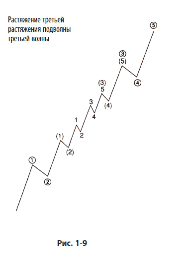 Большинство импульсов содержит то, что Эллиотт называл растяжением. Растяжение – это удлиненный импульс с ярко выраженными внутренними волнами. Подавляющее большинство импульсов содержит растяжение в одной и только в одной из трех действующих подволн. Иногда части растянутой волны имеют почти ту же амплитуду и длительность, что и остальные четыре волны более крупного масштаба, что в целом скорее дает девять волн схожего размера, чем нормальную пятиволновую последовательность. В девятиволновой последовательности иногда трудно сказать, какая из волн растянута. Однако это обычно не так и важно, поскольку в рамках системы Эллиотта наличие девяти– и пятиволновой последовательности имеет одно и то же техническое значение. Диаграммы, изображенные на рис. 1–5, проясняют этот момент.
