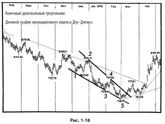 Рис. 1-17 и 1-18 показывают два из этих периодов, иллюстрируя в одном случае восходящее, а в другом – нисходящее направление модели в реальной жизни. На рис. 1-19 показан наш возможный расширяющийся диагональный треугольник. Обратите внимание на то, что в каждом случае за конечным диагональным треугольником следует важное изменение направления.