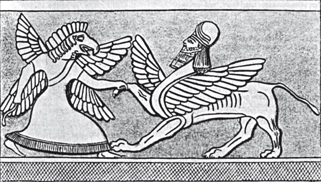 «Эа скрыл приказание в сокровенном тайнике своего сердца; он создал Асузу-намира, сфинкса с четырьмя головами. „Ступай туда, Асузу-намир; у ворот той страны, откуда никто не приходит обратно, покажешь свой облик! Да у видит тебя Аллат и да почувствует радость при виде твоем! Она успокоится в глубине ее сердца, ее гнев исчезнет. Закляни ее именем всемогущих богов“».