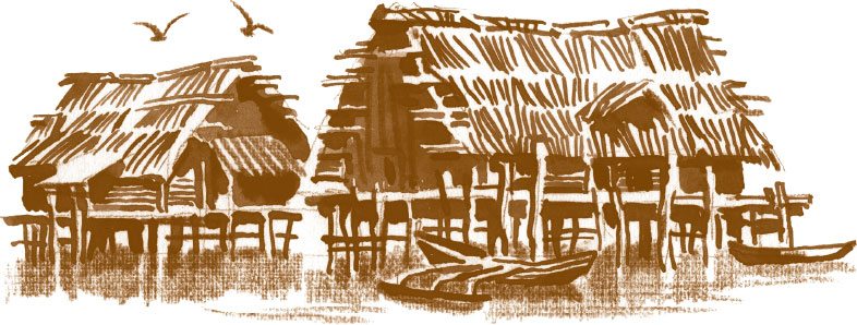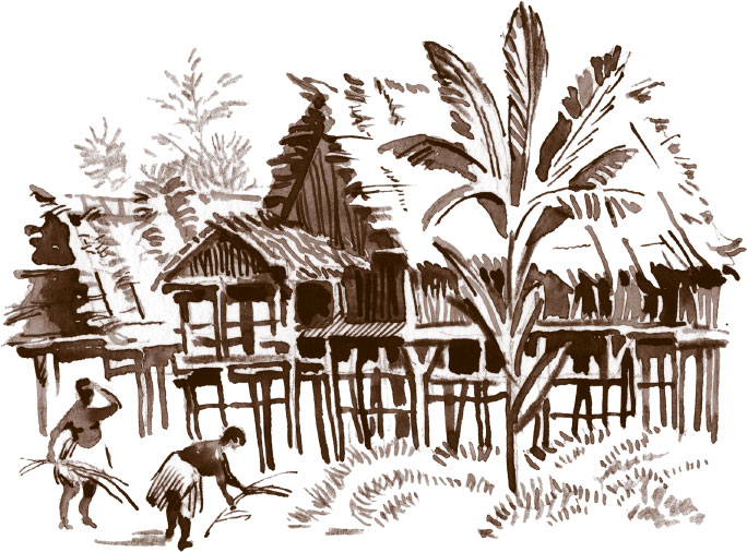 Родное селение Элеле Когхе раскинулось на небольшой возвышенности посреди плоскогорья. Несколько домов, построенных на высоких сваях, вбитых в землю, стояли двумя параллельными рядами, образуя довольно широкую улицу, покрытую хорошо утрамбованной красной глиной. В конце улицы, на краю обрыва, стояло сооружение покрупнее, которое туземцы называли «эмоне». В эмоне происходили собрания старейшин, жили вожди и неженатые члены племени. Жилые дома были оборудованы со стороны улицы небольшими галереями, прикрытыми слегка изогнутыми кверху крышами. Селение было защищено полукругом частокола из заостренных бревен. Это укрепление свидетельствовало о воинственности таваде, которые, ведя непрерывную войну с соседями, опасались их возможного нападения.