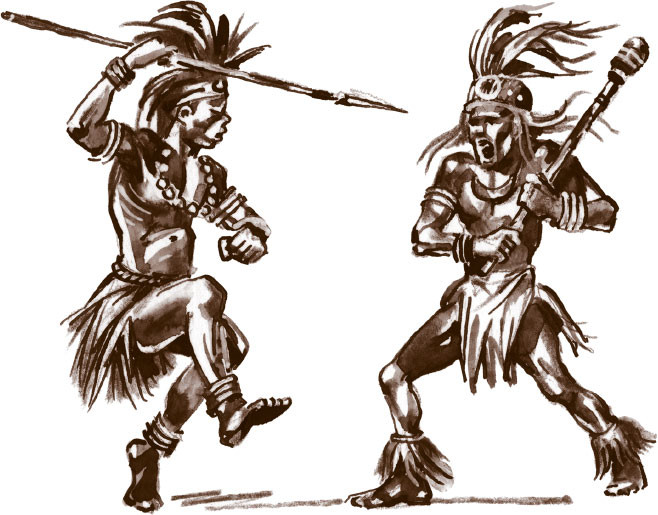 Воины начали немедленную подготовку к походу. Они осматривали оружие, выводили на телах сажей и белой глиной полосы, надевали на головы султаны из птичьих перьев, вешали на шею ожерелья из зубов диких кабанов. Они еще до рассвета были готовы выйти в путь. Но перед походом надо было совершить обряд военного танца.