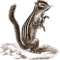 Сибирский бурундук, или полосатая сибирская земляная белка (T. striatus), значительно меньше и неуклюжее обыкновенной белки (длина – 20 см, хвост – 10 см), с продолговатой, усаженной редкими усами головой. Короткий, жесткий мех его имеет общий желтоватый фон, по которому идут на спине пять черных полос; живот – беловато-желтый <…>. Сибирский бурундук обитает чаще всего в кедровых лесах, в подземных норах, куда залегает на зиму, обеспечив себя запасами зерна и орехов. Звучный крик его напоминает жалобный стон совы-зорьки… В лазанье бурундуки уступают белкам, но зато превосходят их в беганье. (А. Брэм. Жизнь животных, т. 1.)