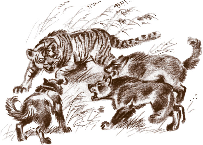 Наконец охотники настигли хищника. Опершись задом о поросшую мохом кучу бурелома, тигр острыми клыками или лапой то и дело пытался достать одного из наседавших псов. Собаки выглядели столь же дико, как и загнанный зверь. Они нападали на него то с боков, то спереди. Их темная, как у волков, шерсть взъерошилась и взлохматилась. Ослепленные охотничьей страстью, псы не обращали внимания на полученные раны. Глаза собак горели кровавым огнем. Отскакивая от внезапного удара лап тигра, они поджимали длинные пушистые хвосты, но тут же, напрягаясь всем телом, готовились к новому прыжку, обнажая острые клыки в широко раскрытых пастях.