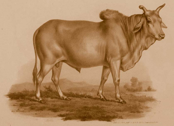 Быки в тесном смысле этого слова, к которым принадлежит крупный рогатый скот, составляют особую группу. Они отличаются широким плоским лбом, большими рогами и короткой густой шерстью. 〈…〉 …в Древнем Египте и Индии уже в ранние времена существовали различные породы домашнего скота. Впоследствии некоторые из них совершенно исчезли или изменились до неузнаваемости, другие, наоборот, сохранили все свои существенные признаки. К последним принадлежат горбатые быки:…индийский зебу (Bos indicus), рыжевато- или серовато-бурого цвета, переходящего иногда в бледно-желтый и даже белый. (А. Брэм. Жизнь животных, т. 1.)