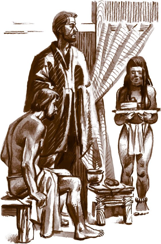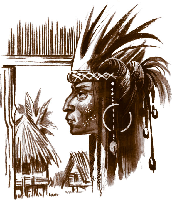 Моряк впервые переступил порог дома шамана. Новицкий знал, что индеец с явным подозрением относится к двум белым пленникам и все время настраивает против них своих сородичей. Онари был племянником предыдущего шамана, которого убил Смуга, когда тот пытался столкнуть в пропасть Салли и Наташу. Большинство кампа поверили Смуге, обвинившему шамана в намерении прервать обряд, однако Онари был не из их числа. Он подозревал, что Смуга коварно убил дядю в собственных целях и обманул доверчивых кампа. Оба пленника ощущали исходившую от этого смекалистого шамана враждебность и предпочитали держаться от него подальше. Именно поэтому Новицкий не без волнения переступил порог его загадочного дома. Едва войдя, он увидел Онари – тот стоял в глубине комнаты, склонившись над подвешенными над тлеющим огнем сосудами. Как и большинство своих сородичей группы амаценге, Онари ходил полуголым. Лишь низ живота прикрывал передник, подвязанный тонким шнурком. Грязное тело и лицо шамана были раскрашены магическим узором. По индейскому поверью, он оберегает от злых духов, порчи, сглаза и укусов ядовитых змей. На голове красовался венец, сплетенный из пальмовых волокон и расцвеченный яркими перьями попугаев, со свисавшим сзади диковинным хвостом из пучка крохотных засушенных колибри. На локтях и щиколотках шаман носил плетеные повязки.