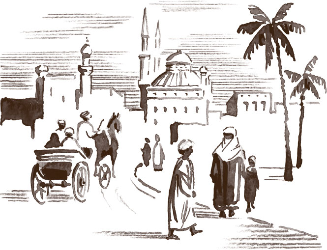 Не меньшая суматоха царила и на проезжей части. По улице уже ходил электрический трамвай, он курсировал от площади Тахрир до Старого Каира. Египтянам полюбился этот вид транспорта, более удобный, чем конка[39]. Вагоны были увешаны гроздьями пассажиров. Люди теснились на подножках вдоль всего вагона. Трамваю приходилось ехать медленно, он то и дело останавливался, вагоновожатые отчаянно трезвонили, пробивая дорогу в толпе пешеходов. Совсем рядом катились тяжелые двухколесные возы, запряженные ослами, лошадьми или верблюдами. Возницы равнодушно покрикивали на неосторожных пешеходов. Нередко за арабом-возницей восседали его жены. В бурливой толпе повозок и людей с цирковой ловкостью лавировали ребятишки, несущие на головах громадные круглые корзины со свежим хлебом. То тут, то там проталкивались характерные фигуры разносчиков воды с большими кувшинами; меланхолично вышагивали ослы, навьюченные корзинами с овощами, мешками с пшеницей, тюками соломы, корзинами кирпича. В ногах путались собаки, кошки, дети в куцых рубашонках. Улица была полна говора, криков, воплей.