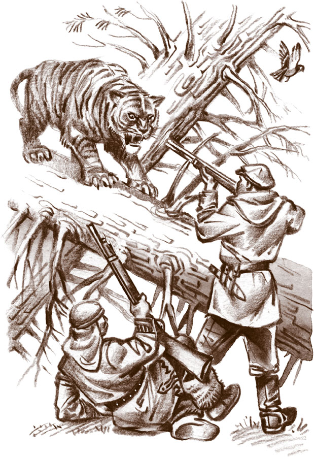 Следы тигрицы вели в сторону лагеря звероловов, но потом снова возвращались назад. Двигаясь по этим следам, охотники сделали небольшой круг, а когда заметили поверх собственных следов свежие следы тигрицы, в страхе остановились. Не было сомнений: тигрица нарочно выманила охотников из удобного для защиты места и теперь кралась за ними.