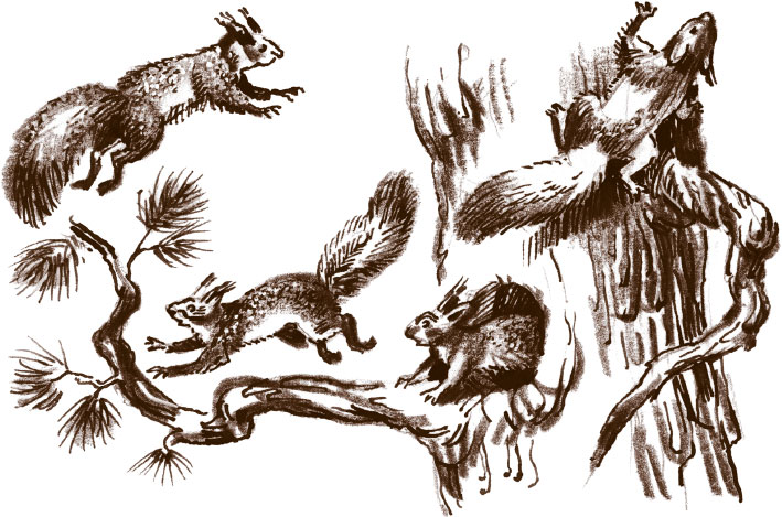 Он вскочил с земли, срезал ножом длинную ветку можжевельника и, недолго думая, воткнул ее в отверстие дупла. Результат был похож на тот, какой бывает, если всадить палку в муравейник. Оказалось, что в дупле находилось гнездо каких-то юрких зверьков. В испуге они выскакивали из дупла и, махая пушистыми хвостами, ловко взбирались на верхние ветки дерева. В первый момент боцман принял их за белочек, но их густой пепельный мех отличался от привычного рыжего цвета.