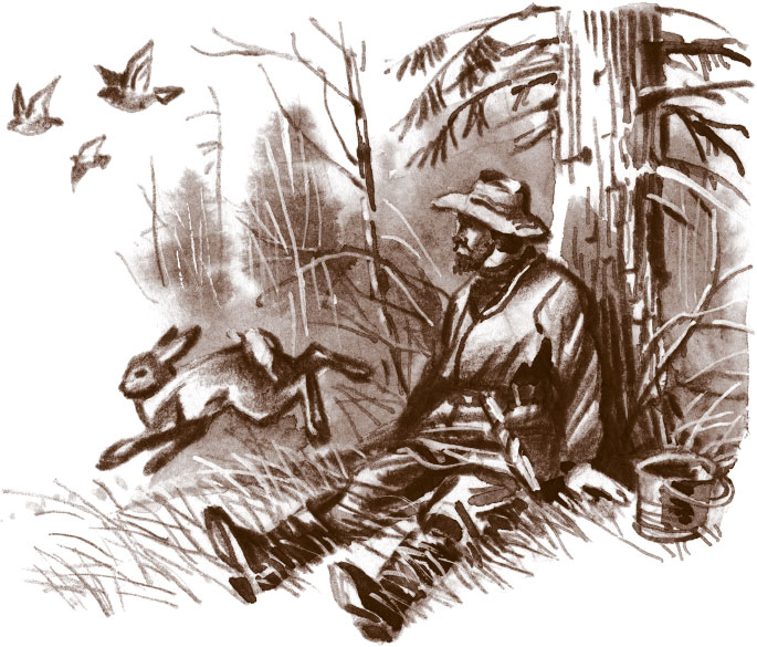 Настойчивое глухое воркование и полет лесных горлиц разбудили распростертого на траве боцмана. Он лениво приоткрыл глаза. Горлицы как раз исчезли в кустах, как вдруг какой-то коричневато-рыжий зверек в своем отчаянном беге перепрыгнул через боцмана, даже перекувыркнувшись у него на груди. Боцман в испуге вскочил на ноги и увидел, как заяц-беляк[22] исчез в зарослях лимонника.