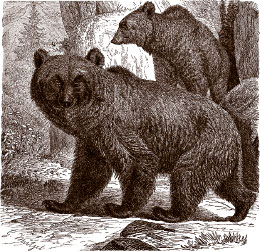 В общем, бурый медведь представляет солидную фигуру – около сажени [2,10 м] и больше длиной, при полутора аршинах [примерно 1,1 м] высоты; весит он иногда до 20 пудов [более 300 кг]. При первом взгляде на эту грозную тушу кажется, что видишь перед собой самое неуклюжее и косолапое животное. Однако такое заключение было бы крайне ошибочно. Несмотря на свою кажущуюся неловкость, медведь выказывает в случае нужды замечательное проворство и прыткость. Он отлично бегает, так что только быстроногие косули, олени и серны могут избежать его когтей. Далее, он превосходно взбирается на гору, чему способствует длина его задних ног; с горы же спускается медленно, так как иначе может легко перекувыркнуться через голову. Кроме того, он недурно плавает, искусно лазает на деревья и, наконец, несмотря на грузность своего тела, легко может делать огромные двухсаженные прыжки. (А. Брэм. Жизнь животных, т. 1.)