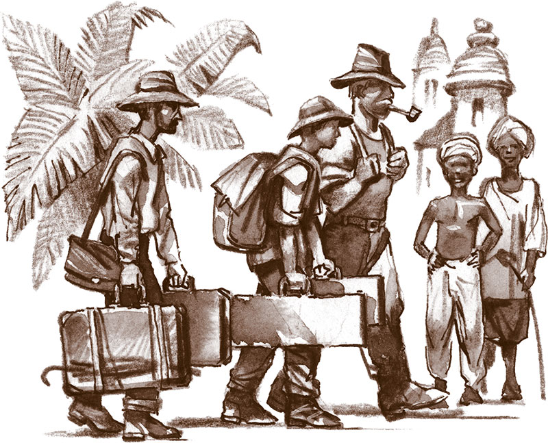 Тощие клячи тронулись с места и поплелись по направлению к Алвару. На некотором расстоянии от вокзала дорога, посыпанная мелким гравием, стала подниматься в гору. Вдоль дороги, среди алоэ и довольно чистых двориков, стояли деревенские домишки, сплетенные из бамбука. Почти перед каждым росло банановое дерево. Наблюдательный Томек обратил на это внимание и поделился своим наблюдением с товарищами. Вильмовский, будучи превосходным географом, знал обычаи народов разных стран и объяснил, что отдельные деревья банана не случайно растут рядом с хижинами индийских крестьян. По местному обычаю каждый индиец в день свадьбы сажает во дворе своего дома банановое дерево, чтобы питательные плоды уберегли семью от голода. Перед хижинами, в тени рододендронов, усыпанных красными цветами, видны были женщины и группки детей.