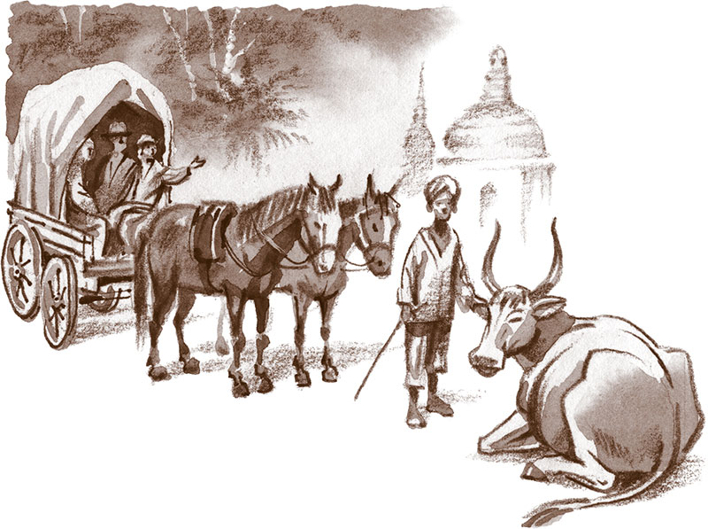 Как раз в этот момент корова, словно не желая злоупотреблять терпением белых сагибов, медленно встала с земли. Отгоняя хвостом рой насекомых, она скрылась в роще у дороги. Кучер не спеша уселся на дышло между лошадьми. Вскоре он крикнул: «Хонг, хай, хай!» Тика гари тронулась в дальнейший путь.