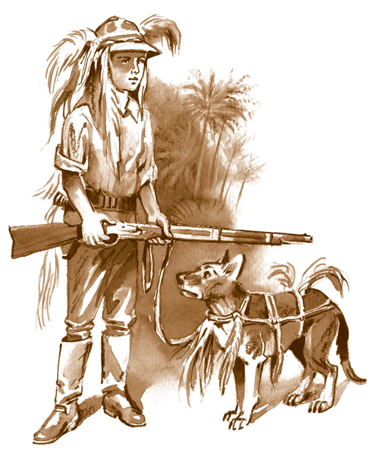 И мальчик, и его собака выглядели странно: на Томеке была белая блуза и длинные брюки, заправленные в голенища сапог, покрытых белым лаком. На голове торчал пробковый шлем с муслиновым платком, спущенным на плечи. К шлему были прикреплены какие-то хвосты, свободно ниспадающие вокруг головы. Из-под закатанных выше локтей рукавов блузы на голые руки тоже спускались куски меха. Не менее странно выглядел Динго. На нем была надета специальная сбруя с прикрепленными к ней меховыми хвостами, развевавшимися при каждом движении, словно флажки. Собака гневно ворчала на них и явно выражала свое неудовольствие, отказываясь повиноваться хозяину.