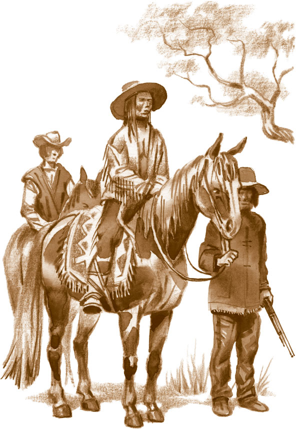 Это были индейцы, одетые в кожаные штаны и такие же куртки. На коротко подстриженных головах у них были надеты фетровые серые широкополые шляпы, совсем такие же, как у кавалеристов Соединенных Штатов. Все всадники были при карабинах.