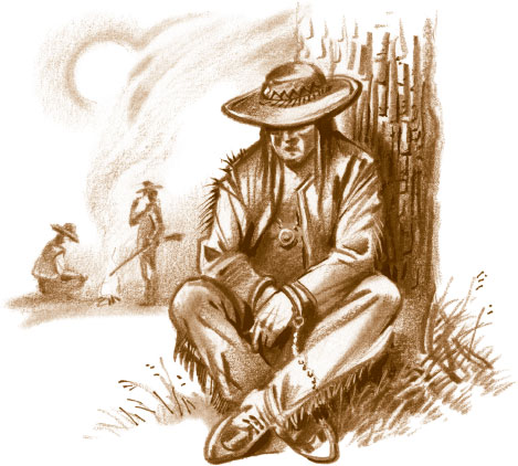 Черная Молния сидел прямо на земле. Руки, скрещенные на животе, судорожно сжаты. На запястьях блестят стальные браслеты, соединенные короткой толстой цепью. Так же скованы и ноги. Порванная одежда ясно говорила о яростном сопротивлении, которое он оказал превосходящему противнику. Но, кроме нескольких царапин, ран не было видно, так как старший отряда, желая захватить пленника живым, отобрал у своих людей ножи и томагавки.