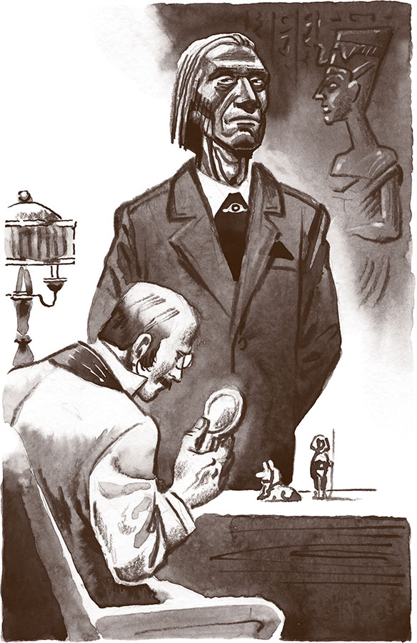О пресловутом сходстве лица незнакомца с изображениями фараонов лорд повторил несколько раз, а потом продолжил рассказ: «Его можно было легко принять за мумию, если бы не его живая мимика и этот пронзительный взор. Признаюсь, он произвел на меня потрясающее впечатление. На миг мне даже показалось, что я не у себя в доме и вообще не в Англии, а где-нибудь в Древнем Египте».