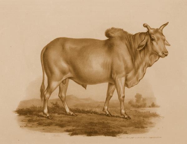 Быки в тесном смысле этого слова, к которым принадлежит крупный рогатый скот, составляют особую группу. Они отличаются широким плоским лбом, большими рогами и короткой густой шерстью. 〈…〉 В Древнем Египте и Индии уже в ранние времена существовали различные породы домашнего скота. Впоследствии некоторые из них совершенно исчезли или изменились до неузнаваемости, другие, наоборот, сохранили все свои существенные признаки. К последним принадлежат горбатые быки:…индийский зебу (Bos indicus), рыжевато- или серовато-бурого цвета, переходящего иногда в бледно-желтый и даже белый. (А. Брэм. Жизнь животных, т. 1.)