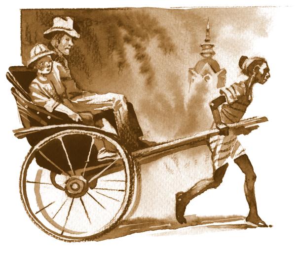 Увидев белых людей, выходящих из порта, три рикши подбежали к ним, таща за собой свои тележки. Наши путешественники уселись и поехали в город по прямым широким улицам.
