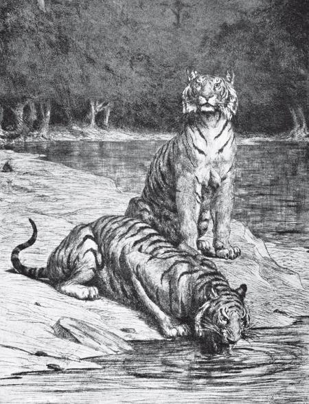 Один из самых типичных представителей семейства кошек – королевский (бенгальский. – Примеч. ред.) тигр (Felis tigris), с одной стороны, красивейшее из животных, с другой – ужаснейший и наиболее опасный для человека из всех диких зверей. Это истинная язва всех стран, где он водится. Это настоящий бич Индии, ежегодно приносящий в жертву своей свирепости страшные человеческие гекатомбы (до тысячи человек). Великолепный мех, светло-желтый, с темными поперечными полосами, круглая голова, обрамленная длинными бакенбардами, продолговатое туловище более сажени длиной (230–260 см, причем самки на 30–40 см меньше) и, наконец, длинный хвост – такова наружность королевского тигра. Бархатные лапы скрывают огромные втяжные когти, а пасть вооружена необыкновенно острыми зубами. 〈…〉…одним ударом лапы ужасный зверь может причинить рану в пять дюймов (около 13 см. – Примеч. ред.) глубиной и переломить бедренную кость верблюда, а в зубах может тащить целого быка несколько миль. (А. Брэм. Жизнь животных, т. 1.)