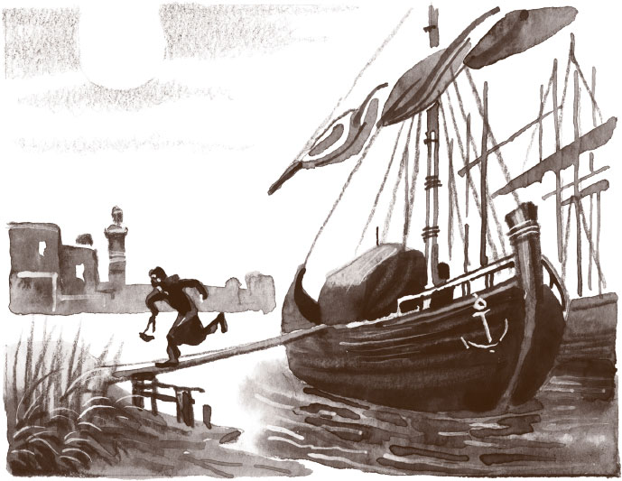 Он даже не заметил, что спокойное ровное дыхание спящего прекратилось и что проснувшийся человек следит за ним, Патриком, из-под полуопущенных век. Когда смельчак проходил мимо кровати, мужчина внезапно схватил его за руку. Мальчик принялся извиваться, как угорь, и мужчина, хотя и был сильным, не смог его удержать. Патрик заметался вокруг стола, беспорядочно размахивая кадилом. Шаткий стол вдруг наклонился от его движений, и светильник повалился на кровать, разбрызгивая горящее масло. Хозяин лодки схватил одеяло и стал гасить огонь, а Патрик, воспользовавшись этим, выбежал в темноту. В речных жилищах загорелись лампы, появились люди. Увидев выбежавшего из лодки мальчишку, кое-кто пустился за ним в погоню. Патрик стал петлять. «Всё как тогда на корабле, – думал он на бегу. – Только прыгать некуда, да и дяди нет рядом…»