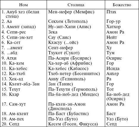 Следствия этого деления территории страны на номы на положение и развитие Египта и его религии были настолько важными, что ниже приводится их список в виде таблицы, включающий некоторые подробности.