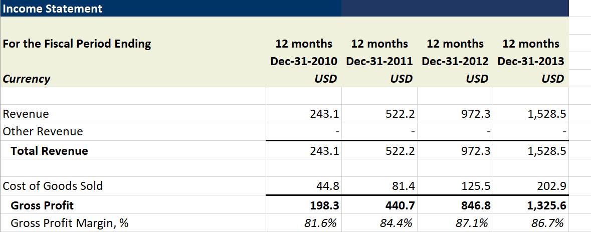 Рассмотрим исторические значения валовой прибыли и ее маржи для LinkedIn Corp (сейчас часть Microsoft Corporation):