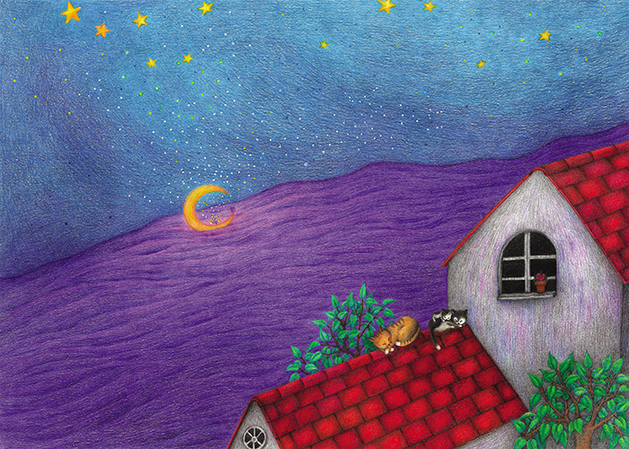 Иногда бывает так, что все-все коты спят, спрятав мордочку под левую лапу, тогда месяц спускается в океан, чтобы смыть с себя звёздную пыль и отдохнуть.