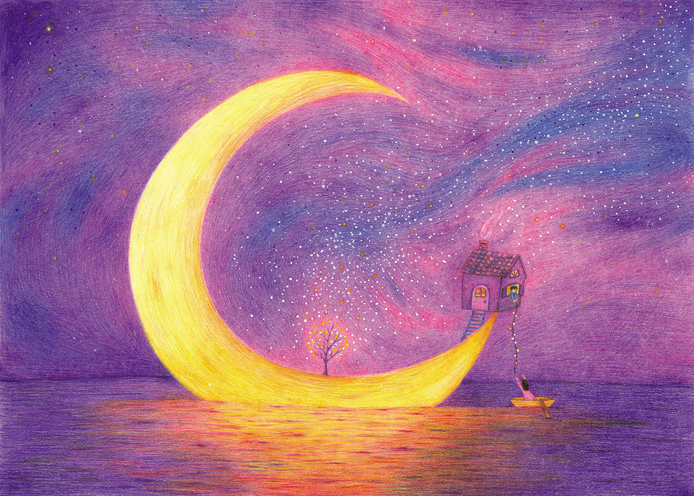 На нижнем роге месяца в небольшом пурпурном домике с цветной черепичной крышей живёт хранитель месяца по имени Лучик. Он то юн, то стар, то полон сил, то пуст, и лишь трём вещам во Вселенной не изменяет его натура: