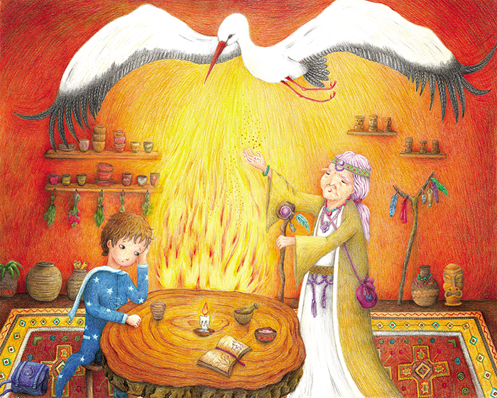Лучик пришёл к своему давнему другу шаману Ска, никто другой не знает о мире больше, чем он, ведь он никогда даже не пытался судить, а принимал всё таким, какое оно есть. В хижине Ска четыре двери: в прошлое, в будущее, в настоящее и в нереализованное. Все стены увешаны травами, кореньями, мешками. Пол застлан коврами, на полках стоят глиняные чашки, тарелки и крынки, расписанные самыми разнообразными сюжетами. На потолке нарисован аист, расправивший крылья. Лучику всегда казалось, что птица заколдована, но Ска уверял, что это просто хороший рисунок.