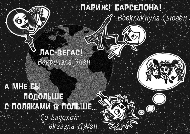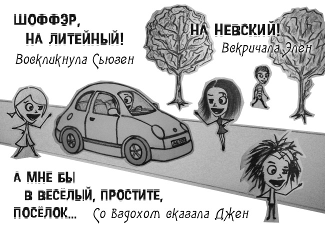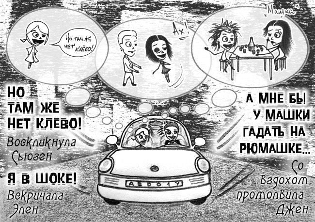 – Вечернее платье! – воскликнула Сьюзен.– Сапожки! – вскричала Элен.– А мне бы тельняшку и полную фляжку, —Со вздохом промолвила Джен.– Париж, Барселона! – воскликнула Сьюзен.– Лас-Вегас! – вскричала Элен.– А мне бы подольше с поляками в Польше, —Со вздохом сказала Джен.– Свободная касса! – воскликнула Сьюзен.– Ты дура! – вскричала Элен.– А мне бы картошку и пива немножко, —Со вздохом промолвила Джен.– Шоффэр, на Литейный! – воскликнула Сьюзен.– На Невский! – вскричала Элен.– А мне бы в Веселый, простите, Поселок, —Со вздохом сказала Джен.– Но там же нет клёво! – воскликнула Сьюзен.– Я в шоке! – вскричала Элен.– А мне бы у Машки гадать на рюмашке, —Со вздохом промолвила Джен.– Зажим… Ѣ! и скальпель! – воскликнула Сьюзен.– Держи-ка! – вскричала Элен.– Ой, что-то мне плохо, девчонки… – со вздохомПоследним сказала Джен.[II’ 2011]