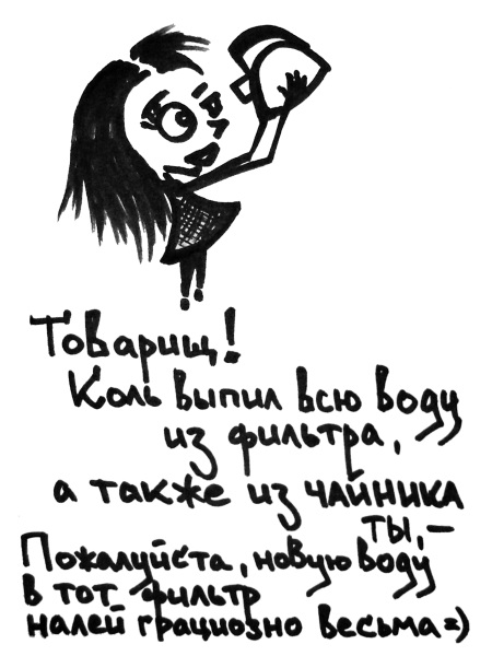Товарищ! Коль выпил всю воду из фильтра,А также из чайника ты,Пожалуйста, новую воду в тот фильтрНалей грациозно весьма![2010–2014]