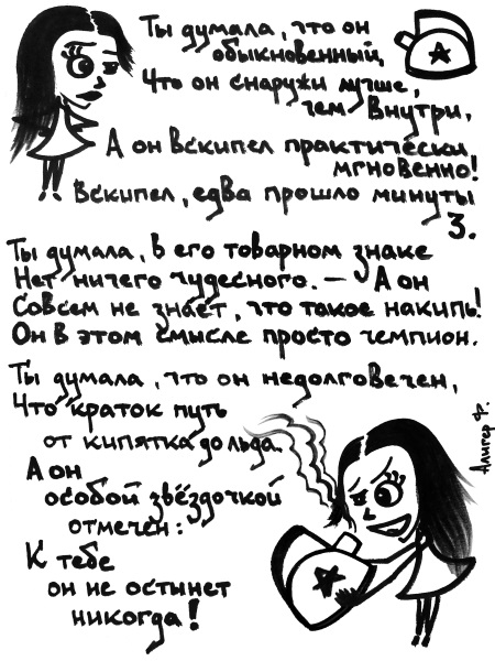 Ты думала, что он – обыкновенный:Что он снаружи лучше, чем внутри.А он вскипел практически мгновенно!Вскипел, едва прошло минуты три.Ты думала, в его товарном знакеНет ничего чудесного. – А онСовсем не знает, что такое накипь!Он в этом смысле просто чемпион.Ты думала, что он недолговечен,Что краток путь от кипятка до льда. —А он особой звездочкой отмечен:К тебе он не остынет никогда!_______________«Ах, если б чувств и мыслей тишь…»