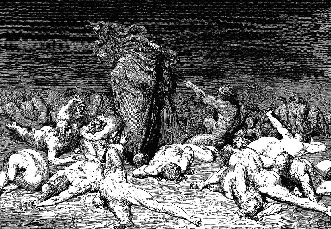 1 Когда опять от тяжкого забвеньяОчнулся я, о муках душ скорбя,Лишившись чувств своих из сожаленья, 4 Я снова увидал вокруг себяРяд призраков и новых мук картины.То был круг третий Ада, где, губя 7 Все встречное, струился дождь на льдины;Проклятый, страшный дождь, и крупный град,И грязный снег слетали на вершины 10 Угрюмых скал. Зловоние и смрад…Там Цербер отвратительно ужасный,С тройною пастью, лаял, дикий взгляд 13 Бросая вкруг, и с жалобой напраснойТонули тени, вспугнутые им.Цвет грозных глаз его – кроваво-красный. 16 Он отличался бешенством своим,Когтями лап и безобразным чревом.Неутомимой злобой одержим,
