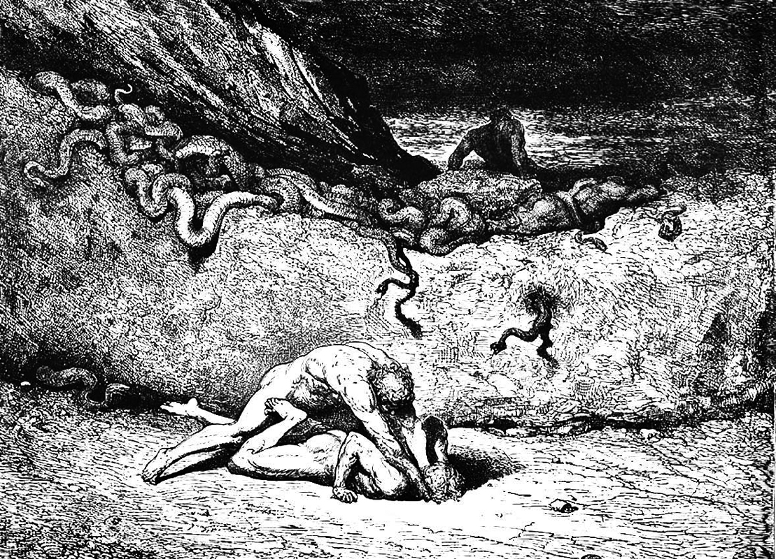 Между восьмым и девятым кругами находятся в каменных колодках гиганты, восставшие против Юпитера. Один из них, Антей, спускает поэтов в десятый, последний круг ада, где казнятся изменники. Он в самом центре земли и представляет собой покрытое льдом озеро, куда вливается четвертая, текущая в аду река Коцит. В этом круге тоже четыре отделения. В первом (Каина) – убийцы близких родственников, во втором (Антенора) – изменники родине, в третьем (Птолемея) – изменники друзьям, в четвертом (Джудекка) – восставшие против бога. Здесь (XXXIII песнь) страшная повесть графа Уголино о башне голода и изображение Люцифера, который в тройной пасти грызет трех самых больших предателей: Брута и Кассия, изменивших Цезарю, и Иуду, предавшего Христа (песнь XXXIV).