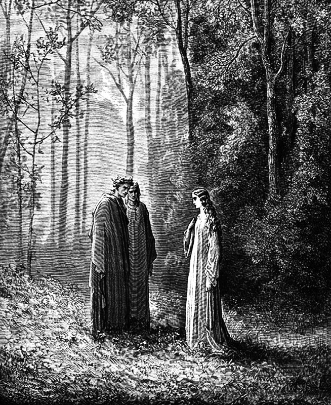 Данте видит колесницу торжествующей церкви, влекомую Грифоном. На ней Беатриче. Она называет поэта по имени, упрекает его за измену ей и приглашает покаяться в грехе сладострастия. Данте повинуется. После этого, созерцая различные символические видения, он просветляется духом и, окунувшись сначала в Лету, реку забвения, потом в Эвное (ясное понимание), становится готов ко вступлению в рай, куда и ведет его Беатриче.