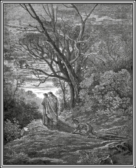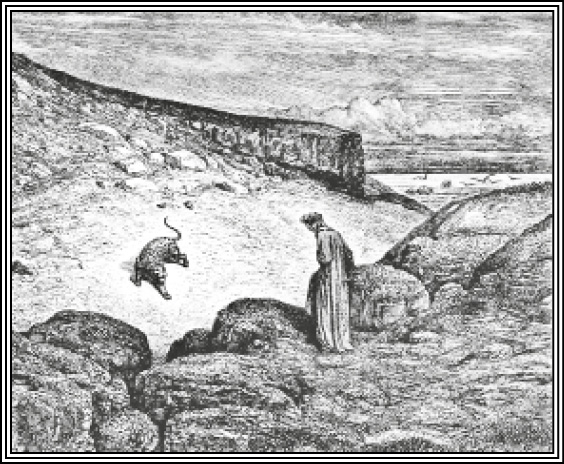 Содержание. Уклонившись в глубоком сне с прямой дороги, Данте пробуждается в темном лесу, при слабом мерцании месяца идет далее и перед дневным рассветом достигает подошвы холма, которого вершина освещена восходящим солнцем. Отдохнув от усталости, поэт восходит на холм; но три чудовища – Барс с пестрою шкурою, голодный Лев и тощая Волчица, преграждают ему дорогу. Последняя до того устрашает Данта, что он уже готов возвратиться в лес, как внезапно появляется тень Виргилия. Данте умоляет ее о помощи. Виргилий, в утешение ему, предсказывает, что Волчица, так его испугавшая, скоро погибнет от Пса, и для выведения его из темного леса предлагает ему себя в провожатые в странствии через Ад и Чистилище, прибавляя, что если он пожелает взойти потом на Небо, то найдет себе вожатую, стократ его достойнейшую. Данте принимает его предложение и следует за ним.