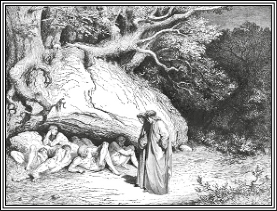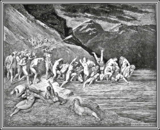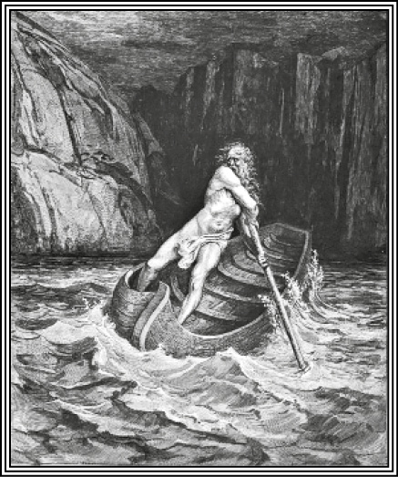 Содержание. Поэты приходят к двери ада. Данте читает над нею надпись и ужасается; но, ободренный Виргилием, нисходит вслед за ним в мрачную бездну. Вздохи, громкий плач и крики оглушают Данта: он плачет и узнает от вождя своего, что здесь, еще вне пределов ада, наказуются среди вечного мрака души людей ничтожных, не действовавших, и трусов, с которыми смешаны хоры ангелов, не соблюдших верность Богу и не принявших стороны Его противника. Затем поэты приходят к первой адской реке – Ахерону. Седовласый Харон, кормщик адский, не хочет принять Данта в свою ладью, говоря, что в ад проникнет он иным путем, и перевозит на другой берег Ахерона толпу умерших. Тогда потрясаются берега адской реки, поднимается вихрь, сверкает молния и Данте падает без чувств.