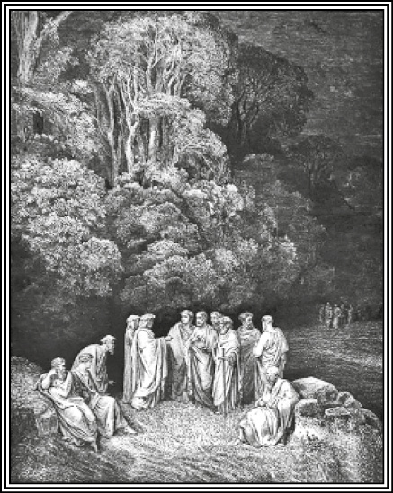 94 Так собрались певцы прекрасных школ Вокруг отца высокого творенья, Что выше всех летает как орел.97 Поговорив друг с другом, знак почтенья Мне воздали они: учитель мой На то смотрел с улыбкой одобренья.100 И был почтен я высшей похвалой: Поставленный в их сонме, полном чести, Я был шестым средь мудрости такой.103 Так к свету шли мы шесть певцов все вместе, Беседуя, но сказанных речей Не привожу, в своем приличных месте.106 Вблизи от нас был дивный град теней, Семь раз венчанный гордыми стенами, И вкруг него прекрасных волн ручей.109 Пройдя поток как сушу с мудрецами, Чрез семь ворот вошли мы в град, где луг Муравчатый открылся перед нами.112 С величием там тени бродят вкруг, И строгое медлительно их око И сладостен речей их редких звук.115 Там, в стороне, взошли мы на высокий, Открытый всюду, озаренный дол, Отколе всех я видеть мог далеко.118 На бархате лугов, я там нашел Великих сонм, скитавшийся пред нами, И, видя их, в восторг я вдруг пришел.121 Электра там со многими друзьями, Меж коих был и Гектор, и Эней, И Цезарь, тень с сокольими очами.124 Камилла там, Пентезилея с ней, И царь Латин, поодаль восседавший С Лавинией, со дщерию своей.127 Там был и Брут, Тарквиния изгнавший, Лукреция с Корнельей средь подруг И Саладин, вдали от всех мечтавший.130 Я взор возвел и мне явился дух — Учитель тех, что в мудрость ум вперяют, И с ним семья философов вокруг.133 Все чтут его, все на него взирают; Один Сократ с Платоном от других К нему всех ближе место занимают.136 И Демокрит, что мир судьбой воздвиг, И Диоген, Зенон с Анаксагором, И Эмпедокд, Орфей, Эвклид меж них;139 Диоскорид, прославившийся сбором, И Цицерон, и Ливий, и Фалес, И моралист Сенека перед взором;142 И Птоломей, изме́ритель небес, И Гиппократ, с Галеном, с Авиценной, И толкователь слов, Аверроэс.145 Но кто ж исчислит весь их сонм почтенный? Мой долгий труд торопит так меня, Что часто речь полна несовершенно.148 Тут лик шести умалился двумя, И я вошел вслед за моим поэтом Из тишины туда, где вихрь, шумя,151 Кружит в стране, не озаренной светом.Песнь V